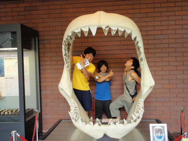 ここは、長瀞の地学や生物の展示をしています。 巨大ザメ「カルカロドン メガロドン」の化石から復元された歯の中でパチリ。 これでまた、ガイドに磨きがかかった・・かな? |
