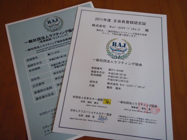 年明け早々、2011年度のRAJ(ラフティング協会)正会員登録認定証が届きました。